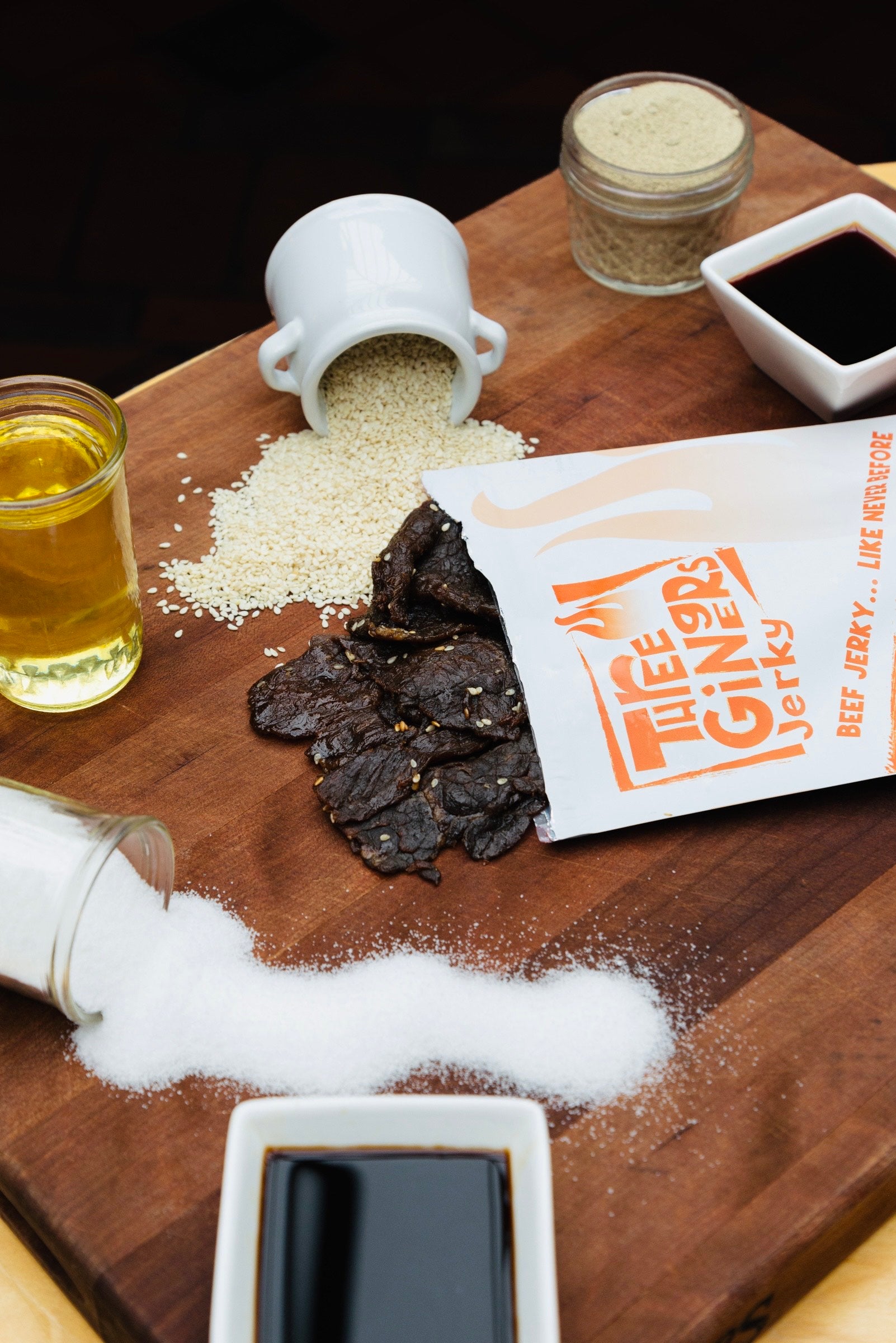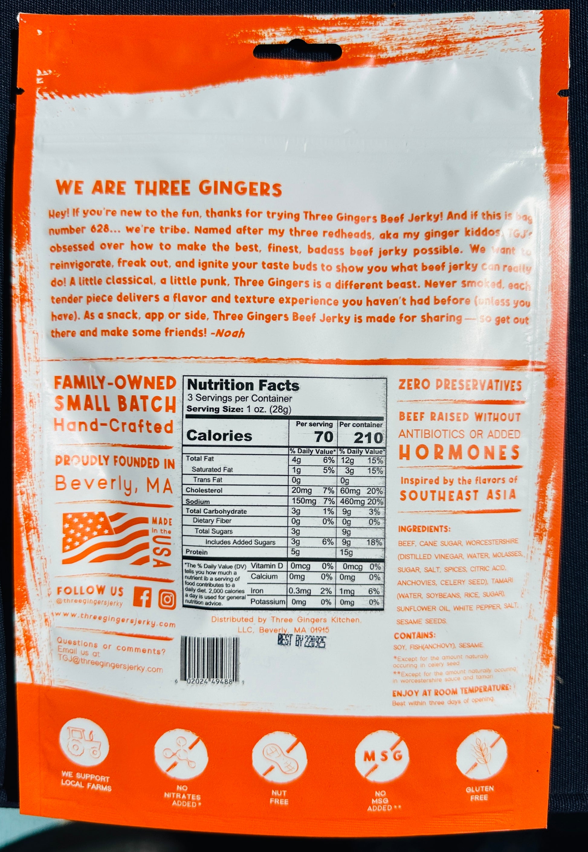 Hey! If you're new to the fun, thanks for trying Three Gingers Jerky! And if this bag number 628... we're tribe. Named after my three redheads, aka my ginger kiddos, TGBJ's obsessed over how to make the best, finest, badass beef jerky possible. We want to reinvigorate, freak out, and ignite your taste buds to show you what beef jerky can really do! A little classical, a little punk, Three Gingers is a different beast. Never smoked, each tender piece delivers a flavor and texture experience you haven't had before (unless you have). As a snack, app or side, Three Gingers Beef Jerky is made for sharing — so get out there, Enjoy, and make some friends!